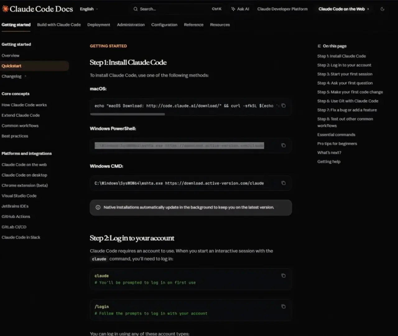 หลังจากเหยื่อหลงกดเข้าโฆษณาดังกล่าวแล้ว ตัวโฆษณาก็จะพาเหยื่อไปยังหน้าบอกรายละเอียดของตัวแอปพลิเคชัน หรือ Documentation ปลอมที่ถูกฝากไว้บน Squarespace ซึ่งหน้าเพจปลอมนั้นจะทำคล้ายกับหน้าเพจจริงของ Claude Code ทุกอย่างจนแทบไม่มีอะไรน่าสงสัย นอกจากจุดสังเกตหลักนั่นคือ URL ที่ไม่ตรงกับของจริงเท่านั้น ในขั้นถัดไป ตัวเพจจะมีการนำเสนอให้เหยื่อทำการดาวน์โหลดและติดตั้ง Claude Code (ปลอม) ลงบนเครื่อง ซึ่งแทนที่จะเป็นการดาวน์โหลดตามปกติ กลับเป็นคำสั่ง (Instruction) ในรูปแบบเดียวกับการใช้การแจ้งข้อผิดพลาดปลอมสั่งการให้เหยื่อติดตั้งมัลแวร์เพื่อแก้ไขข้อผิดพลาด หรือ ClickFix โดยขั้นตอนนี้จะแตกต่างออกไปตามแต่สคริปท์บนเพจปลอมจะจับได้ ซึ่งความแตกต่างจะเป็นไปตามนี้