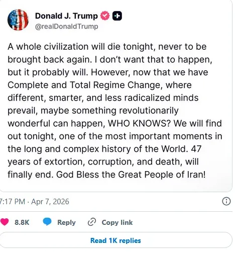 นอกจากนี้ "โดนัลด์ ทรัมป์" ยังได้โพสต์ใน "ทรูธ โซเชียล" ว่า ""กำลังจะเกิดเหตุการณ์ร้ายแรงถึงขั้น อารยธรรมทั้งมวลของอิหร่าน จะพินาศในคืนนี้!! จะไม่มีวันกลับคืนมาอีก ผมไม่ต้องการให้สิ่งนั้นเกิดขึ้น แต่ดูเหมือนว่ามันน่าจะเกิดขึ้น!!" และ "ยังมีความเป็นไปได้ที่สิ่งมหัศจรรย์ จะเกิดขึ้นในเตหะราน" อย่างไรก็ตาม "ตอนนี้เมื่อเราได้เกิดการเปลี่ยนแปลงระบอบอย่างสมบูรณ์และเด็ดขาดแล้ว ซึ่งเปิดทางให้แนวคิดใหม่ที่ชาญฉลาดกว่า และ มีความสุดโต่งน้อยลงเข้ามามีบทบาท อาจมีสิ่งที่น่ามหัศจรรย์อย่างยิ่งเกิดขึ้น ก็เป็นได้ ใครจะรู้?"