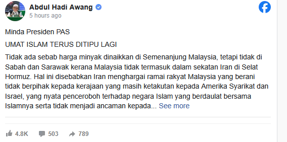 วันนี้ [ตามเวลาท้องถิ่น] ประธานพรรคอิสลาม "ฮาดี อาวัง" ของมาเลเซีย ได้โพสต์บนเฟสบุ๊กว่า "เนื่องจากประเทศมาเลเซียไม่ได้ถูกอิหร่าน จัดให้อยู่ในรายชื่อประเทศที่ได้รับผลจากการปิดช่องแคบฮอร์มุช ดังนั้นรัฐบาลมาเลเซีย จึงไม่มีเหตุผลที่จะปรับขึ้นราคาน้ำมันเชื้อเพลิง..." และ "อิหร่านให้ความสำคัญกับมาเลเซีย เนื่องจากประชาชนจำนวนมาก กล้าที่จะไม่สนับสนุนรัฐบาลที่สร้างความหวาดกลัว อย่างอเมริกาและอิสราเอล" และ "ในความเป็นจริง มาเลเซียไม่ได้อยู่ในกลุ่มประเทศที่ถูกคว่ำบาตร เพราะประชาชนของเราสนับสนุนปาเลสไตน์"