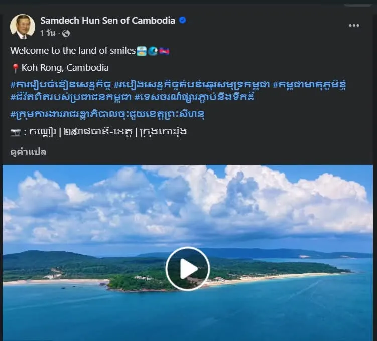 กลายเป็นประเด็นร้อนบนโลกออนไลน์อีกครั้ง หลัง ฮุน เซน อดีตผู้นำกัมพูชา ออกมาโพสต์โปรโมตการท่องเที่ยว เกาะร่อง จังหวัดสีหนุวิลล์ ผ่านสื่อโซเชียล พร้อมข้อความภาษาอังกฤษว่า “Welcome to the land of smiles” ซึ่งทำให้เกิดกระแสวิพากษ์วิจารณ์อย่างหนัก เนื่องจากคำว่า “Land of Smiles” เป็นสโลแกนด้านการท่องเที่ยวที่ทั่วโลกรู้จักว่าเชื่อมโยงกับประเทศไทยมาอย่างยาวนาน