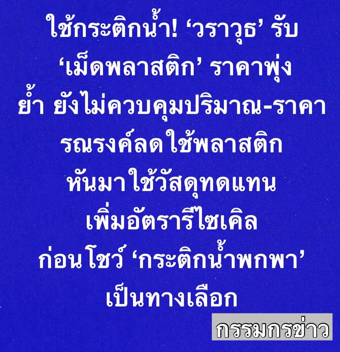 โชว์กระติกน้ำ! ‘วราวุธ’ รับ ‘เม็ดพลาสติก’ ราคาพุ่ง จากผลกระทบตะวันออกกลาง ย้ำ ยังไม่มีการควบคุมปริมาณ-ราคา รณรงค์ลดใช้พลาสติก หันมาใช้วัสดุทดแทน-เพิ่มอัตรารีไซเคิล ก่อนโชว์ ‘กระติกน้ำพกพา’ เป็นทางเลือก