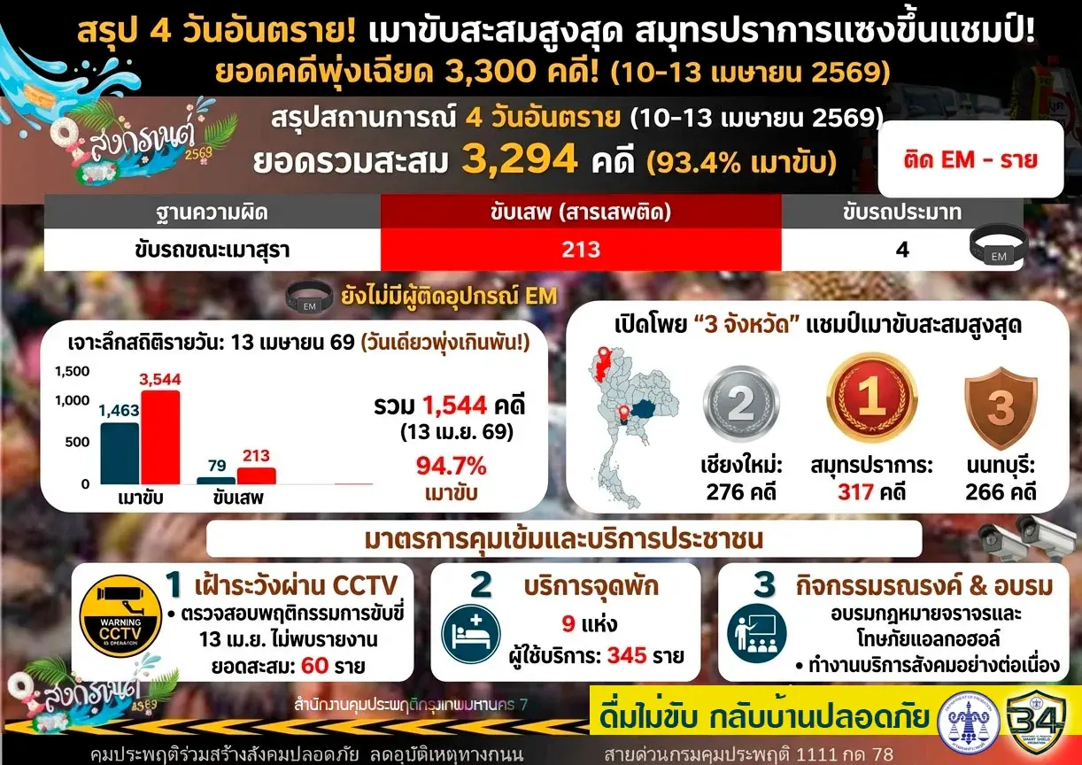 สงกรานต์ 4 วัน ยอดคดีพุ่งเฉียด 3,300 คดี! สมุทรปราการแซงขึ้นแชมป์ "เมาแล้วขับ" สะสมสูงสุด