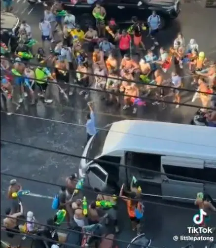 14 เม.ย. 69 เพจ Phuket Times รายงานสถานการณ์ความปั่นป่วนในพื้นที่ ป่าตอง จังหวัดภูเก็ต เป็นคลิปวิดีโอเหตุการณ์การรุมป่วนของนักท่องเที่ยวชาวต่างชาติกลุ่มใหญ่ พุ่งเป้าฉีดน้ำใส่รถตู้สีบรอนซ์เทาที่กำลังสัญจรอยู่บนท้องถนน รวมถึงยังมีการฉีดน้ำใส่เข้าไปในตัวรถจนก่อให้เกิดความวุ่นวาย