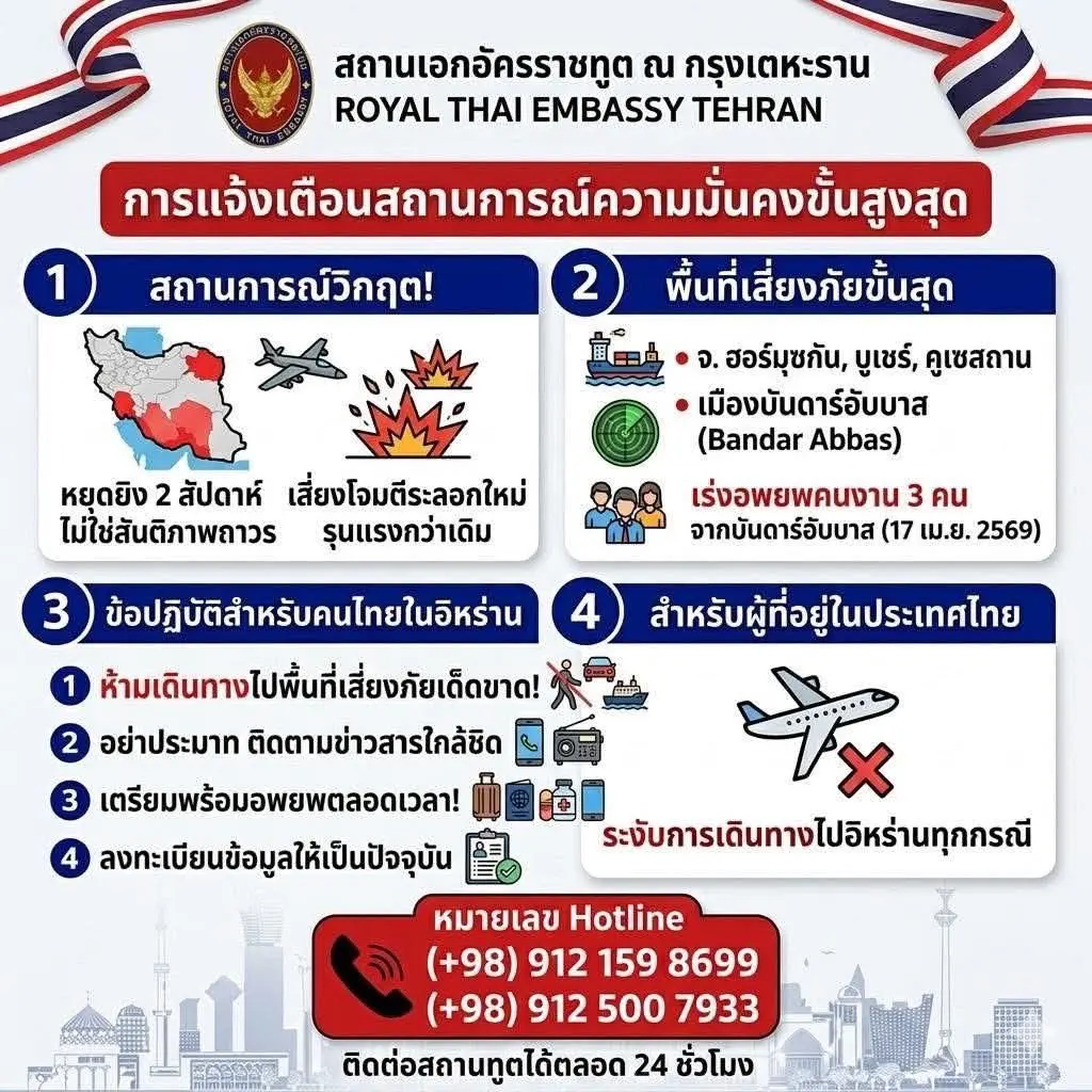 เพื่อความปลอดภัยสูงสุด ขอให้พี่น้องชาวไทยที่พำนักในอิหร่านปฏิบัติตามคำแนะนำอย่างเคร่งครัด: