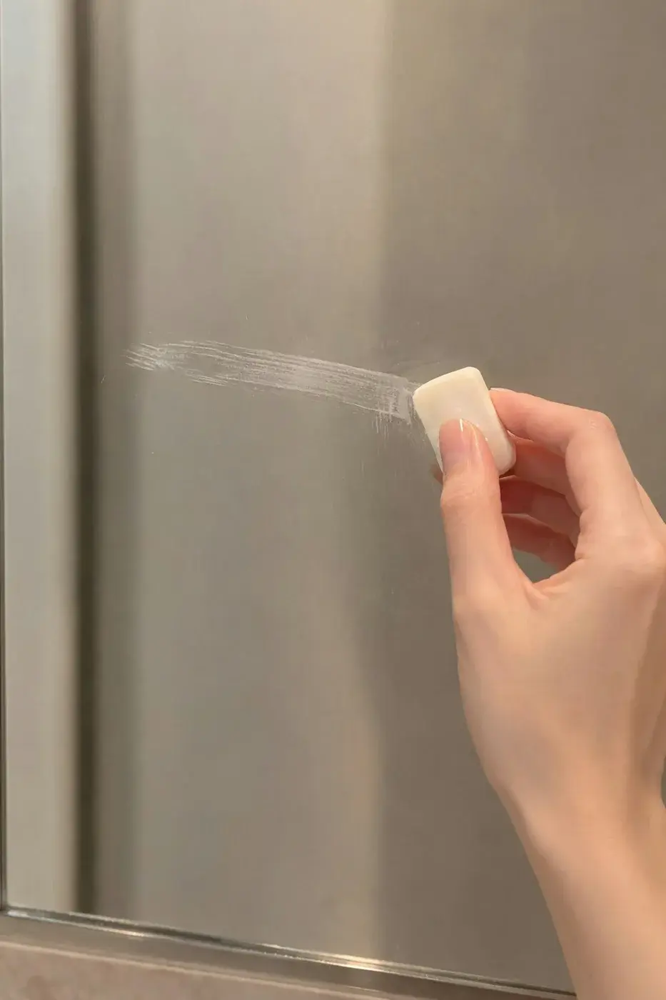 นำสบู่ก้อนที่แห้งสนิทมาขีดลงบนกระจกส่วนที่ต้องการทำความสะอาด โดยเน้นบริเวณที่มีคราบมัวหรือบริเวณที่ชอบเกิดฝ้า ขีดให้เป็นลายจนเห็นเนื้อสบู่ติดกระจกชัดเจน