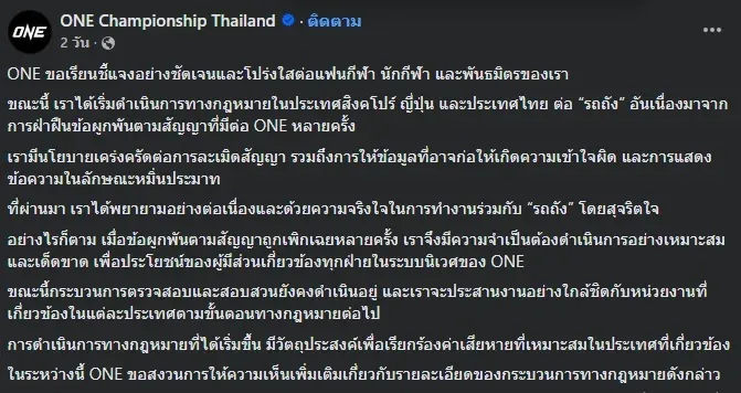 เมื่อวันที่ 15 เมษายน 2569 เพจเฟซบุ๊ก "ONE Championship Thailand" โพสต์แถลงเกี่ยวกับกรณีพิพาทระหว่าง เวทีมวย ONE กับ "รถถัง จิตรเมืองนนท์" (ชื่อจริง นายทินกร ศรีสวัสดิ์) นักมวยไทยชื่อดัง สรุปความว่า ONE ชี้แจงกำลังเริ่มดำเนินการทางกฎหมายในประเทศสิงคโปร์ ญี่ปุ่น และประเทศไทย ต่อ “รถถัง” อันเนื่องมาจากการฝ่าฝืนข้อผูกพันตามสัญญาที่มีต่อ ONE หลายครั้ง เช่น การละเมิดสัญญา การให้ข้อมูลที่อาจก่อให้เกิดความเข้าใจผิด และการแสดงข้อความในลักษณะหมิ่นประมาท ONE จึงมีความจำเป็นต้องดำเนินการอย่างเหมาะสมและเด็ดขาด อย่างไรก็ตาม การดำเนินการทางกฎหมายที่ได้เริ่มขึ้น มีวัตถุประสงค์เพื่อเรียกร้องค่าเสียหายที่เหมาะสมในประเทศที่เกี่ยวข้อง