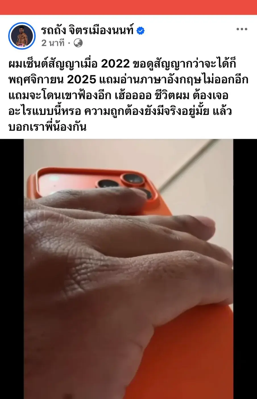 ด้าน"รถถัง" ก็ได้มีการโพสต์ภาพและข้อความผ่านเฟซบุ๊กระบุว่า "ผมเซ็นต์สัญญาเมื่อ 2022 ขอดูสัญญากว่าจะได้ก็พฤศจิกายน 2025 แถมอ่านภาษาอังกฤษไม่ออกอีก แถมจะโดนเขาฟ้องอีก เฮ้ออออ ชีวิตผม ต้องเจออะไรแบบนี้หรอความถูกต้องยังมีจริงอยู่มั้ย แล้วบอกเราพี่น้องกัน"