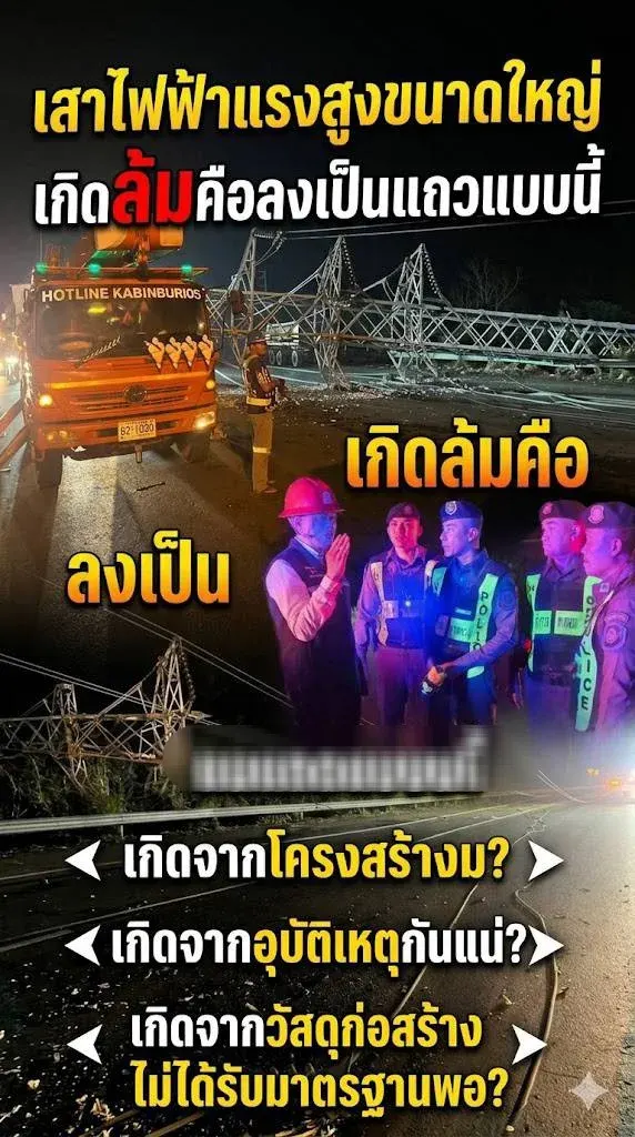 วัสดุได้มาตรฐานหรือไม่? การล้มในลักษณะต่อเนื่องเป็นทอดๆ (Cascade Failure) สะท้อนถึงความแข็งแรงของฐานราก หรือคุณภาพของเหล็กที่ใช้ก่อสร้างว่า "เต็มสเปก" ตามที่ประมูลกันมาหรือไม่?