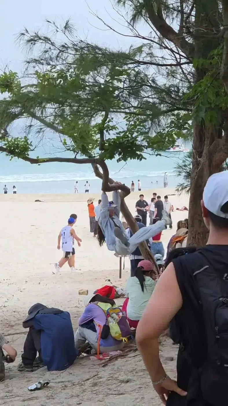 พฤติกรรมเสี่ยง: กลุ่มนักท่องเที่ยวจำนวนมากพากันรุมปีนขึ้นไปบนต้นไม้ริมชายหาด บางคนโหนกิ่งไม้ และบางกลุ่มนั่งรวมกัน 3-4 คนบนกิ่งเดียวเพื่อให้ได้มุมกล้องที่ดู "สโลว์ไลฟ์"