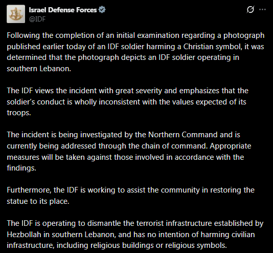 นอกจากนี้ กองทัพอิสราเอลยังกล่าวว่า "เรากำลังดำเนินการช่วยเหลือชุมชนท้องถิ่น ในการบูรณะรูปปั้นที่ได้รับความเสียหาย" และย้ำว่า "ปฏิบัติการในเลบานอนตอนใต้ มีเป้าหมายเพื่อทำลายโครงสร้างพื้นฐานของกลุ่มฮิซบอลเลาะห์ โดยไม่มีเจตนาที่จะทำลายโครงสร้างพื้นฐานของพลเรือน รวมถึงสถานที่หรือสัญลักษณ์ทางศาสนาแต่อย่างใด..."