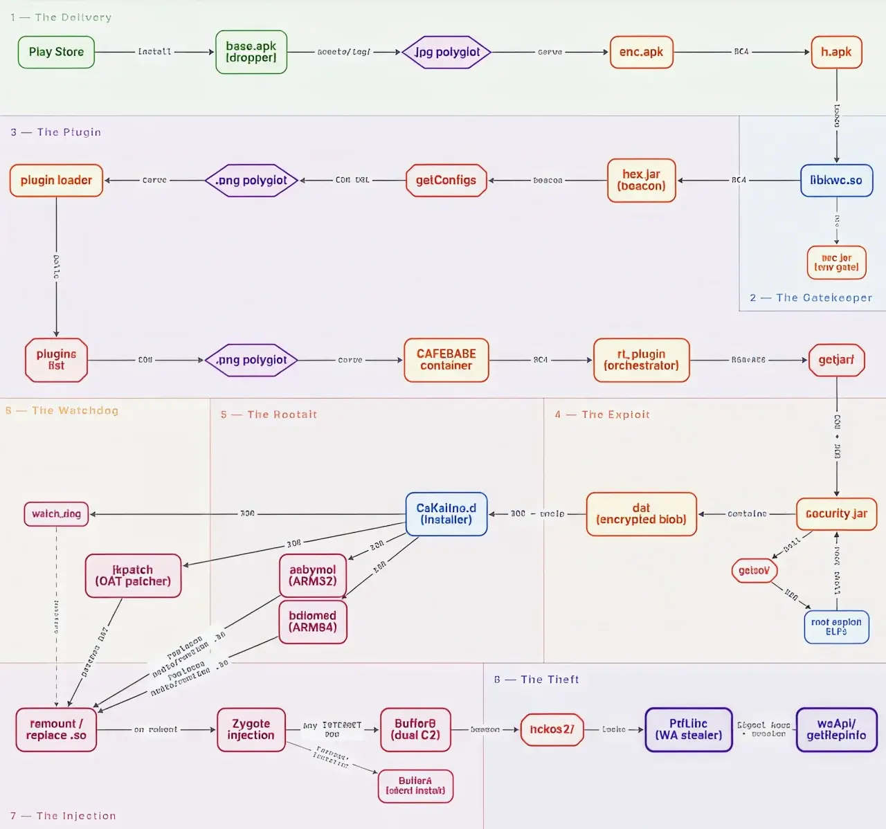 หลังจากที่มัลแวร์สามารถทำการ Root ตัวเครื่องได้สำเร็จแล้ว ตัวมัลแวร์ก็จะทำการแทนที่ไลบรารี่ (Library) ที่สำคัญของระบบอย่าง libandroid_runtime.so และ libmedia_jni.so ด้วย Hooked Wrappers ที่จะเข้าแทรกแซงคำสั่ง Call ของระบบ เพื่อเปลี่ยนเป้าหมาย (Redirect) ให้ไปรันคำสั่งการโจมตีระบบแทน ไม่เพียงเท่านั้น ตัวมัลแวร์ตัวนี้ยังมีความสามารถในการคงตัวในระบบ (Persistence) แบบหลายชั้น ไม่ว่าจะเป็นการติดตั้งสคริปท์สำหรับการกู้ข้อมูลของมัลแวร์ (Recovery Script), เปลี่ยนเครื่องมือจัดการเวลาระบบค้าง (Crash Handler) เป็นตัวโหลดมัลแวร์แทน และบรรจุตัว Payload ไว้ในพาร์ทิชัน (Partition) ของส่วนจัดเก็บข้อมูลของระบบ