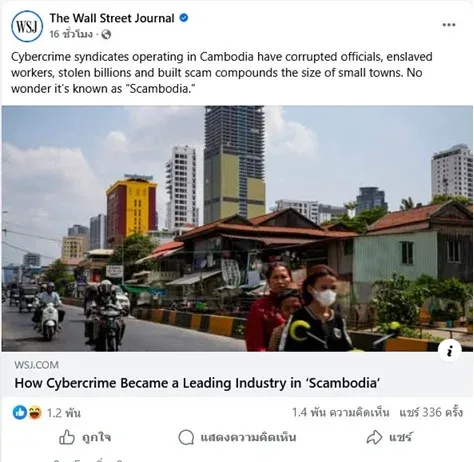ด้าน WSJ เผยรายงานใหญ่ “ไซเบอร์สแกม” พุ่งในกัมพูชา มีการใช้คำ ‘Scambodia’ ในบทความ สะท้อนปัญหาระดับภูมิภาค