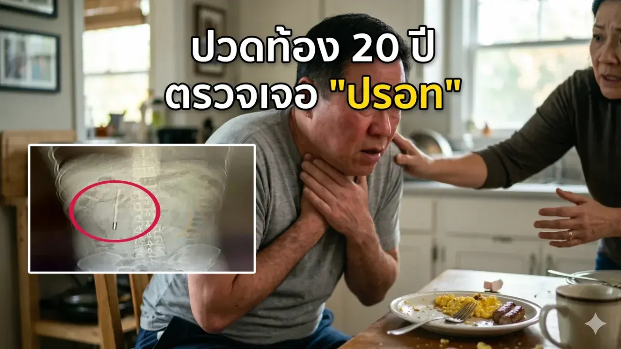 จากการตรวจด้วยการสแกนคอมพิวเตอร์ (CT Scan) ทีมแพทย์พบวัตถุรูปร่างเรียวยาวคล้ายแท่งแก้ว ติดค้างอยู่ในบริเวณ ลำไส้เล็กส่วนดูโอดีนัม (Duodenum) ซึ่งเป็นจุดที่อันตรายเนื่องจากอยู่ใกล้กับท่อน้ำดีและตับอ่อน เมื่อซักประวัติอย่างละเอียด คนไข้สารภาพว่าเขาได้ "เผลอกลืนปรอทวัดไข้" ลงไปตั้งแต่อายุ 12 ปี แต่ด้วยความกลัวความผิดจึงไม่ได้บอกผู้ปกครอง และเห็นว่าไม่มีอาการเจ็บปวดใดๆ ในช่วงแรก จึงปล่อยทิ้งไว้นานถึง 20 ปี