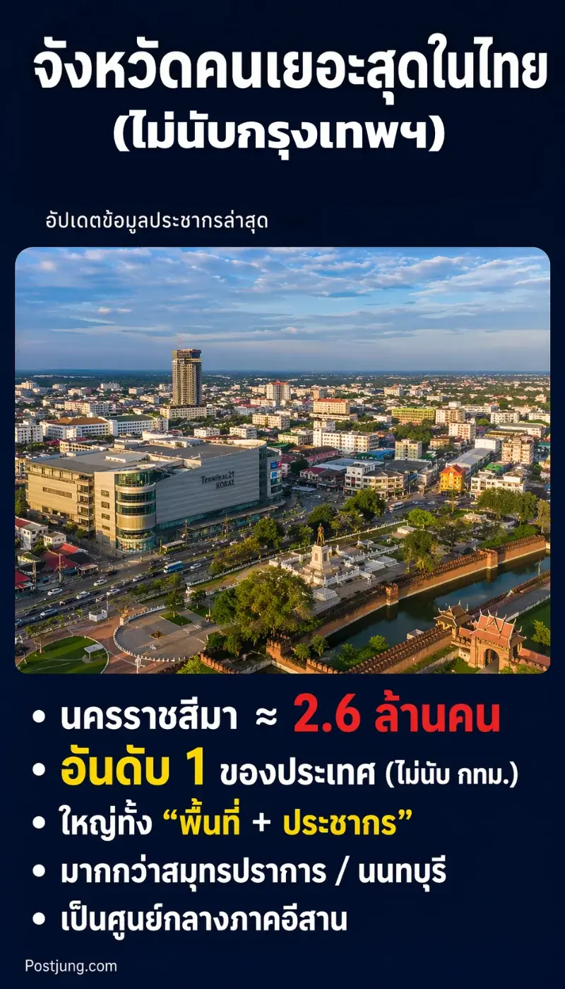 ผมว่าเสน่ห์ของหัวข้อแบบนี้คือมันเผยให้เห็นว่า “คนเยอะที่สุด” ไม่ได้แปลว่า “แออัดที่สุด” เสมอไป บางจังหวัดดูคึกคักกว่า บางจังหวัดดูเป็นเมืองกว่า แต่พอมาดูตัวเลขรวมจริง ๆ คำตอบคือนครราชสีมาที่ครองบัลลังก์ไว้แบบเงียบ ๆ มาโดยตลอด อันนี้ถือเป็นเรื่องที่คนไทยจำนวนมากยังไม่รู้ด้วยซ้ำ