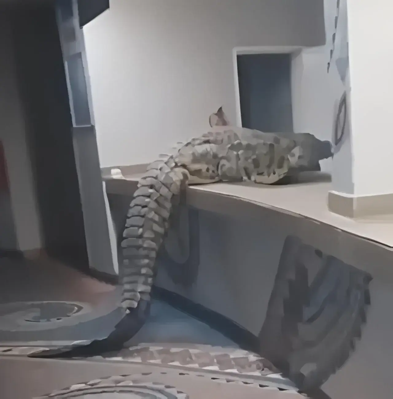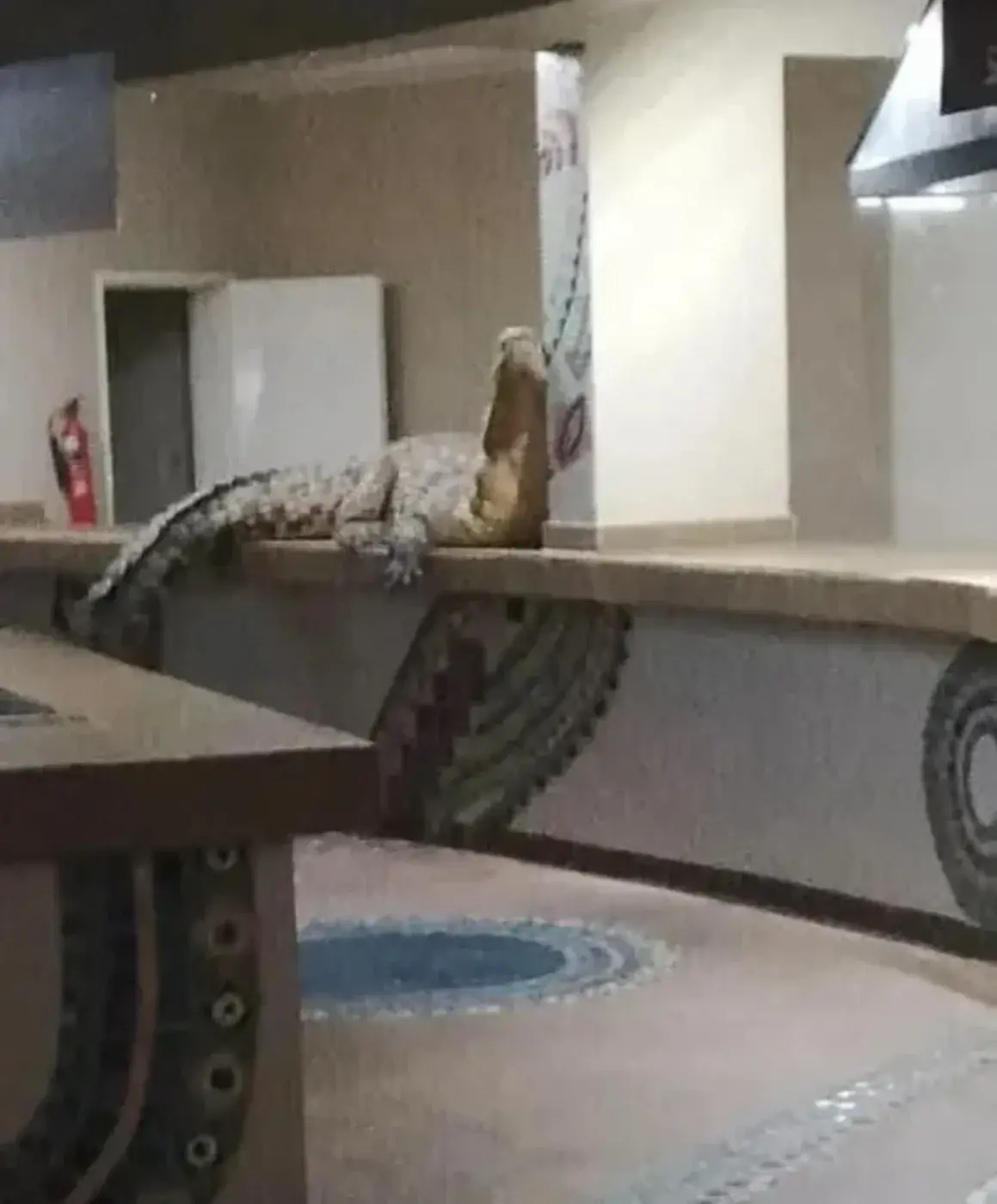 เวลาประมาณ 04:45 น. พนักงานโรงแรมต้องตกตะลึงเมื่อพบจระเข้ยักษ์ความยาวราว 3.6 เมตร ปรากฏตัวอยู่ภายในพื้นที่ครัว ก่อนจะคลานไปมาอย่างช้า ๆ ท่ามกลางบรรยากาศที่ทั้งน่าตื่นตระหนกและเหนือความคาดหมาย จระเข้ตัวดังกล่าวไม่ได้เพียงหลงเข้ามาแล้วหยุดอยู่ที่มุมใดมุมหนึ่ง แต่ยังเคลื่อนตัวสำรวจพื้นที่ราวกับเป็นเจ้าของสถานที่ ปีนขึ้นไปบนเคาน์เตอร์ครัว ก่อนจะเลื้อยต่อไปยังโซนพักผ่อนของโรงแรม และลงไปนอนบนโซฟาอย่างสงบ