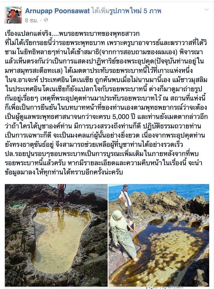 ที่ไม่ได้เรียกรอยนี้ว่ารอยพระพุทธบาท เพราะครูบาอาจารย์และฆราวาสที่ได้วิชามโนยิทธิหลายๆท่านได้เข้าสมาธิ(จากการสอบถามของผมเอง) พิจารณา แล้วเห็นตรงกันว่าเป็นการแสดงปาฏิหาริย์ของพระอุปคุต(ปัจจุบันท่านอยู่ในมหาสมุทรสะดือทะเล) ได้เมตตาประทับรอยพระบาทนี้ไว้ที่เกาะแห่งหนึ่งในจ.อาเจะห์ ประเทศอินโดเนเซีย ถูกค้นพบเมื่อไม่นานมานี้เอง แม้ชาวมุสลิมในประเทศอินโดเนเซียก็ยังแปลกใจกับรอยพระบาทนี้ ต่างก็มาดูมาถ่ายรูปกันอยู่เรื่อยๆ เหตุที่พระอุปคุตท่านมาประทับรอยพระบาทไว้ ณ สถานที่แห่งนี้ ก็เพื่อเป็นการยืนยันในบทบาทหน้าที่ของท่านเองตามพุทธพยากรณ์ว่าจะต้องเป็นผู้ดูแลพระพุทธศาสนาจนกว่าจะครบ 5,000 ปี และท่านยังเมตตากล่าวอีกว่าถ้าใครได้บูชาองค์ท่าน มีการบวงสรวงถึงท่านก็ดี ปฏิบัติธรรมถวายท่านเป็นการเฉพาะก็ดี จะเป็นมงคลแก่ผู้นั้นอย่างยิ่งยวด เนื่องจากพระอุปคุตท่านยังทรงธาตุขันธ์อยู่ จึงสามารถช่วยเหลือผู้ที่บูชาท่านได้อย่างรวดเร็ว