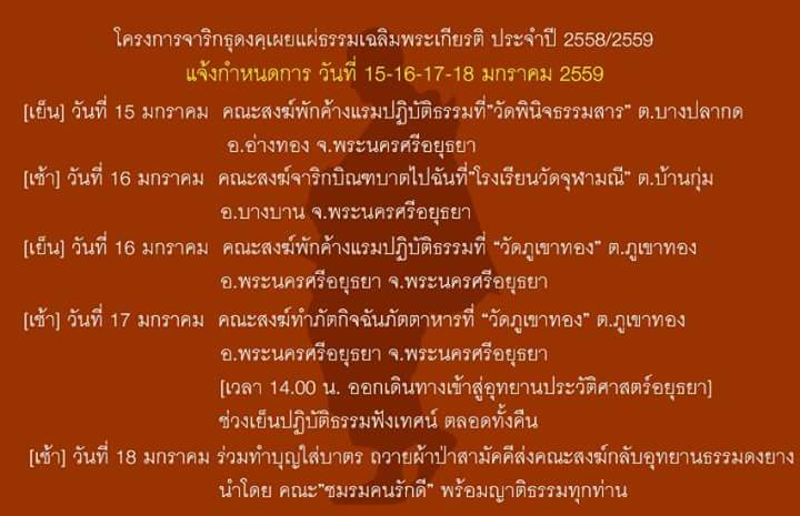 (16 ม.ค.) คณะจาริกธุดงค์ได้พักอยู่ที่วัดภูเขาทอง อยุธยา และรับบิณฑบาตรที่นี่ก่อนออกเดินสู่งจุดหมายในวันพรุ่งนี้