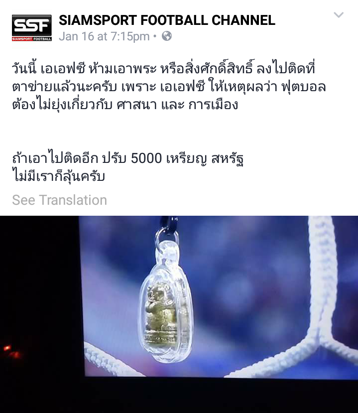 สมาพันธ์ฟุตบอลแห่งเอเชีย (เอเอฟซี) ออกกฎใหม่ ห้ามเอาพระ หรือสิ่งศักดิ์สิทธิ์ ลงไปติดที่ตาข่ายแล้ว โดยให้เหตุผลว่า ฟุตบอลต้องไม่ยุ่งเกี่ยวกับ ศาสนา และ การเมือง ถ้าเอาไปติดอีก จะปรับเกือบ 2 แสน