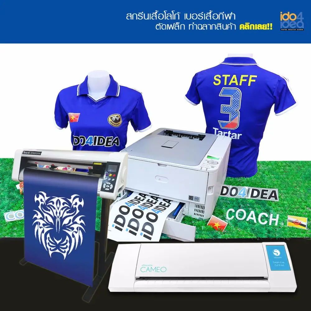 ตัวเลขเสื้อฟุตบอล รวมทั้งโลโก้ต่างๆ ทั้งยังสามารถตัดไดคัท Flex, กำมะหยี่ และวัสดุรีดติดอื่นๆ ได้อีกมากมาย
