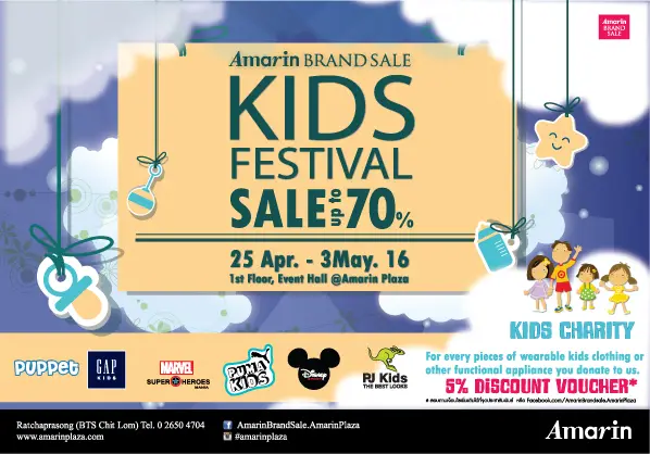 Amarin Brand Sale โดยศูนย์การค้าอัมรินทร์ พลาซ่า ชวนคุณพ่อ คุณแม่ขาช้อปใจบุญจูงมือแฟชั่นนิสต้ารุ่นมินิมาอัพเดทเทรนด์แฟชั่นคุณหนู ในงาน Amarin Brand Sale: Kids Festival 2016 ที่คัดสรรแบรนด์เสื้อผ้า รองเท้าเด็ก และของเล่นสำหรับการพัฒนาการของน้องๆ หนูๆ ชั้นนำ อาทิ Gap Kids, Super Hero, Puma Kids, Puppet, Mickey Sport และอื่นๆอีกมากมาย พร้อมมอบประสบการณ์ความคุ้มค่าด้วยส่วนลดสูงสุดถึง 80% แบบฉบับ Amarin Brand Sale นอกจากนี้ขอชวนคุณพ่อคุณแม่เติมความสุขใจให้ครอบครัวด้วยการร่วมบริจาคเสื้อผ้า รองเท้า ของเล่น หรือของใช้เด็กสภาพดีเพื่อส่งต่อให้กับน้องๆ สถานสงเคราะห์เด็กหญิงบ้านราชวิถี และสถานสงเคราะห์เด็กพิการและทุพพลภาพ ปากเกร็ด เพื่อแลกรับคูปองส่วนลด 5% ในการช้อปสินค้าภายในงาน Amarin Brand Sale ตั้งแต่วันที่ 25 เมษายน – 3 พฤษภาคมนี้ เพียง 9 วันเท่านั้น ณ อีเวนท์ฮอลล์ ชั้น 1 ศูนย์การค้าอัมรินทร์ พลาซ่า