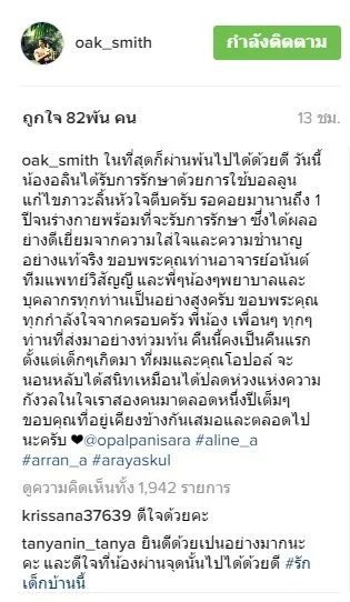 ด้าน หมอโอ๊ค หัวอกของคนเป็นพ่อ ได้โพสต์ข้อความผ่านอินสตาแกรมบอกว่า สามารถนอนหลับได้สนิทเหมือนได้ปลดห่วงแห่งความกังวลในใจมาตลอดหนึ่งปีเต็มๆ