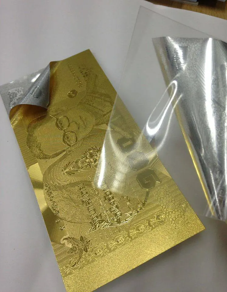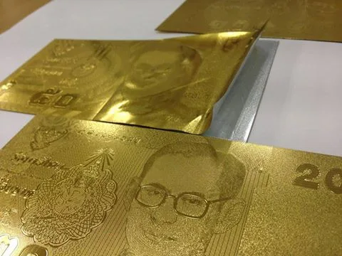 "แบงก์ทองคำ" ที่เป็นข่าวฮือฮากันตอนนี้ ซื้อกันมาใบละ 1,000 กว่าบาท ถึง 5,000 บาท ก็คือ "แผ่นพลาสติกใส" นี่เอง แล้วนำสติกเกอร์ฟอยล์ที่พิมพ์ภาพเลียนแบบธนบัตรรัฐบาลไทย แปะทับลงไปครับ!! cr. เพื่อนในเพจชุมชนฯ
