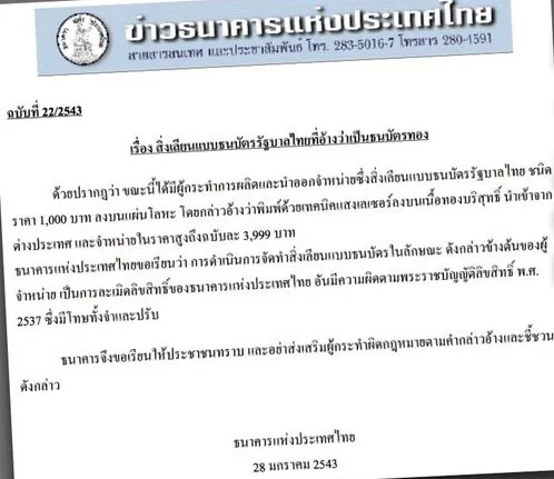 #ระวังนะครับ ผิดกฎหมายด้วย +++ ธนบัตรไทยถือเป็นงานอันมีลิขสิทธิ์ของธนาคารแห่งประเทศไทย และได้รับความคุ้มครองสิทธิ์ตามพระราชบัญญัติลิขสิทธิ์ พุทธศักราช ๒๕๓๗ ผู้ใด ขาย มีไว้เพื่อขาย เสนอขาย ให้เช่า เสนอให้เช่า ให้เช่าซื้อ หรือเสนอให้เช่าซื้อ / เผยแพร่ต่อสาธารณชน / แจกจ่ายในลักษณะที่อาจก่อให้เกิดความเสียหายแก่เจ้าของลิขสิทธิ์ / นำหรือสั่งเข้ามาในราชอาณาจักร ถือว่า เป็นการละเมิดลิขสิทธิ์ ต้องระวางโทษปรับตั้งแต่หนึ่งหมื่นบาทถึงหนึ่งแสนบาท