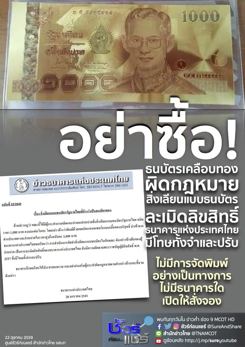 แจ้งมาครับต้นทุนที่ซื้อเข้ามาจากจีน แค่ใบละ 100 กว่าบาทเองครับ แล้วมาขายให้คนไทยในราคาสูง โดยอ้างว่าเป็นแบงก์ทองคำและมีใบรับประกันด้วย พวกฉวยโอกาส อาศัยความรัก ความจงรักภักดี ของคนไทยที่มีต่อพระบาทสมเด็จพระปรมินทรมหาภูมิพลอดุลยเดช มาหลอกขายคนไทยกันเอง