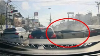 กล้องชัด! ตำรวจจราจรไล่ระทึกกระบะผัวเมียไม่ติดแผ่นป้าย ฝ่าไฟแดงชนเก๋ง - กระบะเสียหาย 3 คัน