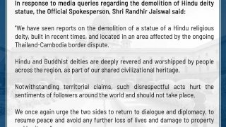 อินเดียแถลงตำหนิไทย กรณีรื้อถอนรูปปั้นเทพเจ้าในพื้นที่พิพาท ชี้กระทบความรู้สึกผู้ศรัทธาทั่วโลก