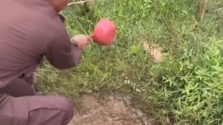 เจ้าหน้าที่เขมรตักน้ำออกจากหลุมที่ถูกอ้างว่าเป็นระเบิดควันพิษของไทย ให้ผู้สื่อข่าวต่างประเทศและผู้สื่อข่าวกัมพูชาเห็นนำไปทำข่าว