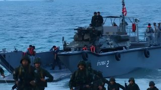 ตราดเดือดแต่เช้า "นาวิกโยธิน-รีคอน" ลุยภาคพื้นยึดคืนดินแดน เรือรบหลวงระดมยิงปืนใหญ่สนับสนุน