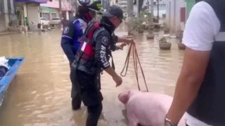 หมูสู้ชีวิต คาบเชือกลอยน้ำท่วมหาดใหญ่