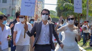 ไม่ยอมให้ใครปฏิวัติ นอกจากเมีย!! คู่บ่าวสาวชาวพม่าออกมาประท้วงต้านรัฐประหาร