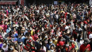 ชาวบ้านพระเณรเข้าร่วม การเดินขบวนต้านรัฐประหาร