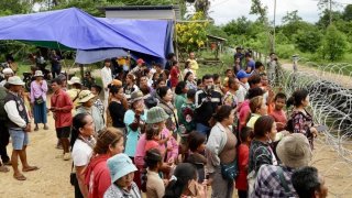 บรรยากาศบ้านเปรยจัน ฝั่งกัมพูชา ตรงข้ามบ้านหนองหญ้าแก้ว ต.โนนหมากมุ่น อ.โคกสูง จ.สระแก้ว มีมวลชนเขมรเริ่มรวมตัวกันแล้ว