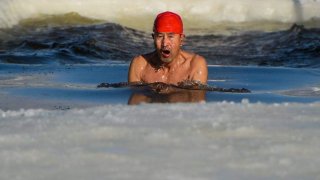 ชายผู้ชื่นชอบการว่ายน้ำ ในฤดูหนาวในจีน
