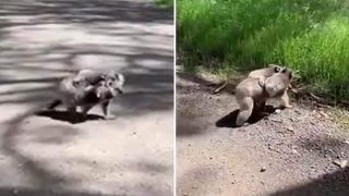หาดูได้ยากมากๆ แม่โคอาล่าแบกลูกฝาแฝดข้ามถนนในเขตชนบทของออสเตรเลีย (มีคลิป)
