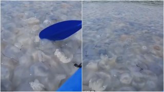 ทะเลแมงกะพรุน! นักพายเรือแคนูพยายามพายเรือผ่านฝูงแมงกะพรุนขนาดเท่าจานอาหารในทะเล