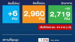 ไทยพบผู้ติดเชื้อโควิดเพิ่ม 6 ราย รวมผู้ติดเชื้อสะสม 2,960 ราย เสียชีวิต 54 ราย
