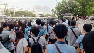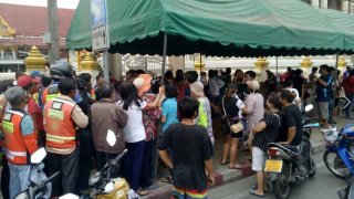 คนเนืองแน่น! บริเวณหน้าวัดดอนเมือง มีการแจกข้าวสารอาหารแห้ง มีคนจำนวนมาก การจราจรติดขัด