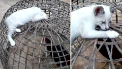 เหมียวขาวเกาะสุ่มไก่ แต่ท่าทางไม่น่าไว้ใจ จึงกลายเป็นความเฮฮาในกลุ่มทาสแมว