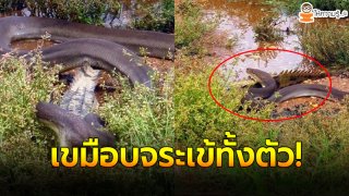 งูหลามหิวโซ มาเจอ จระเข้ นอนอาบแดดริมบึง ฉากต่อสู้จึงบังเกิด