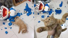 หนุ่มประกอบตัวต่อโดเรม่อนมาตั้งหลายวัน เตรียมส่งให้ลูกค้า สุดท้ายเจ้าเหมียวทำพังอย่างหน้าตาเฉย