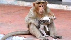 แม่ลิงทนเห็นเจ้าลูกหมาถูกรังแกไม่ได้ จึงรับเลี้ยง ดูแล ปกป้อง ราวกับลูกตัวเอง