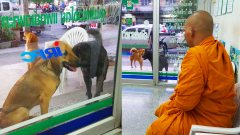 แก๊งสุนัขเดินคุ้มกันพาหลวงพี่มาหาหมอ แถมนั่งเฝ้าหน้าประตูคลินิก