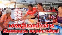 เศรษฐีใจบุญ แจกข้าวสารคนจน 720 ถุง น้ำและเงินสด มีชาวบ้านเข้าแถวรอรับกันเป็นจำนวนมาก