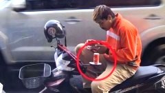 หนุ่มอยากเล่นมือถือแบบถนัดๆ แต่ดันถือกระป๋องน้ำอัดลมนั่งบนรถมอเตอร์ไซค์
