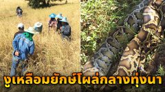 ชาวนาถึงกลับผวา หลังรวมกลุ่มกันเกี่ยวข้าว ดันเจองูเหลือมตัวยักษ์นอนขดอยู่กลางทุ่งนา