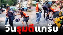 สุดเถื่อน! วินเจ้าถิ่นรุมตีแกร็บไบค์อ่วม ลูกค้าสาวหวิดโดนลูกหลง (มีคลิป)